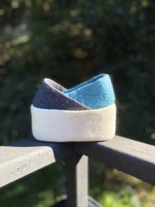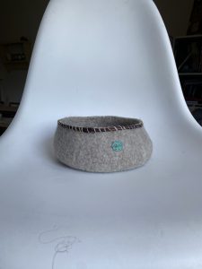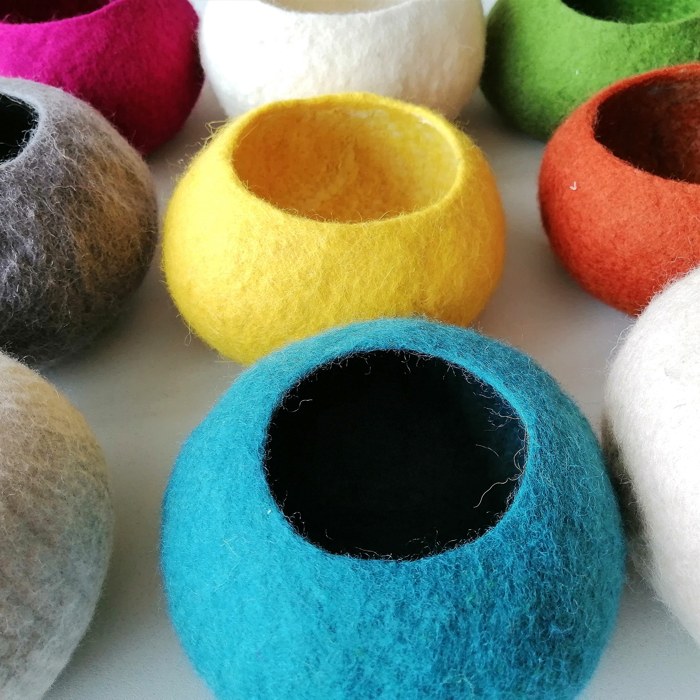 Cada pieza es única, hecha a mano en fieltro con fibras naturales y tintes vegetales.